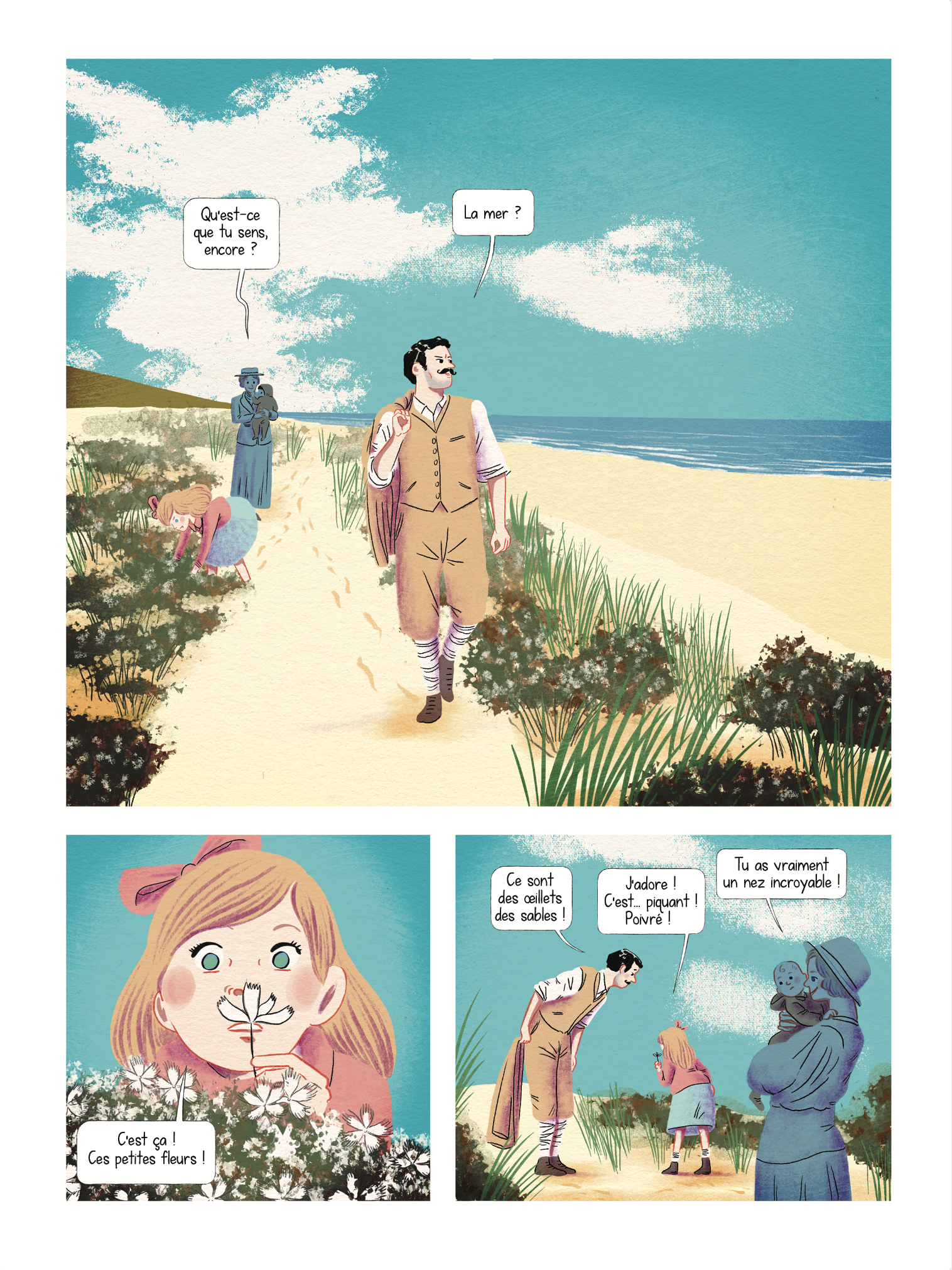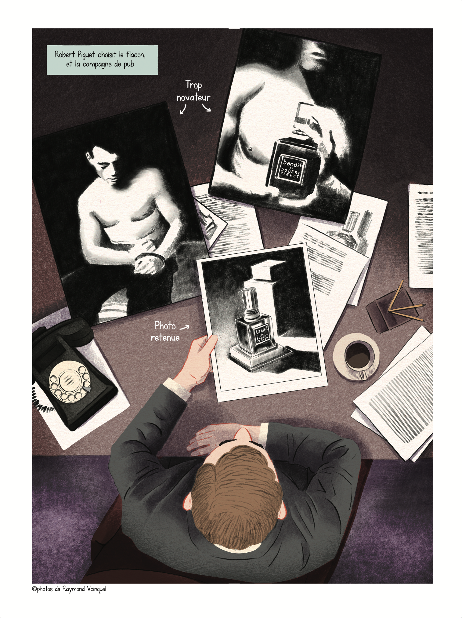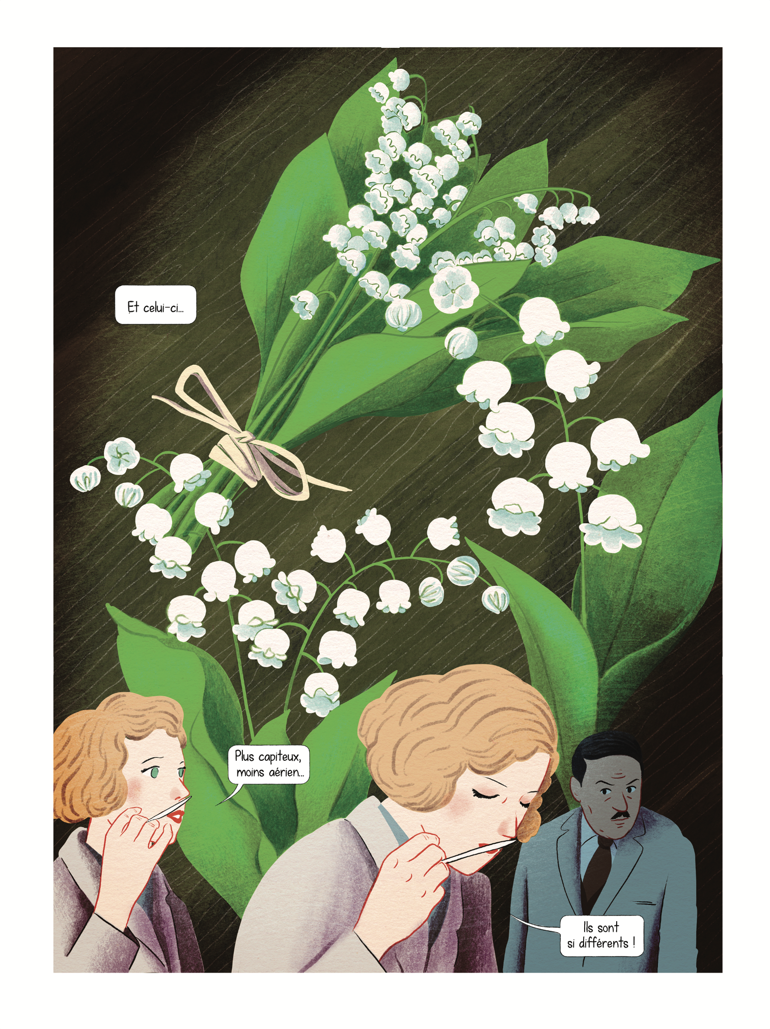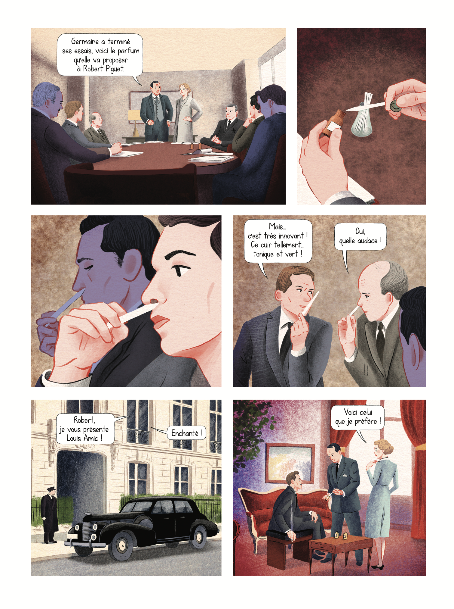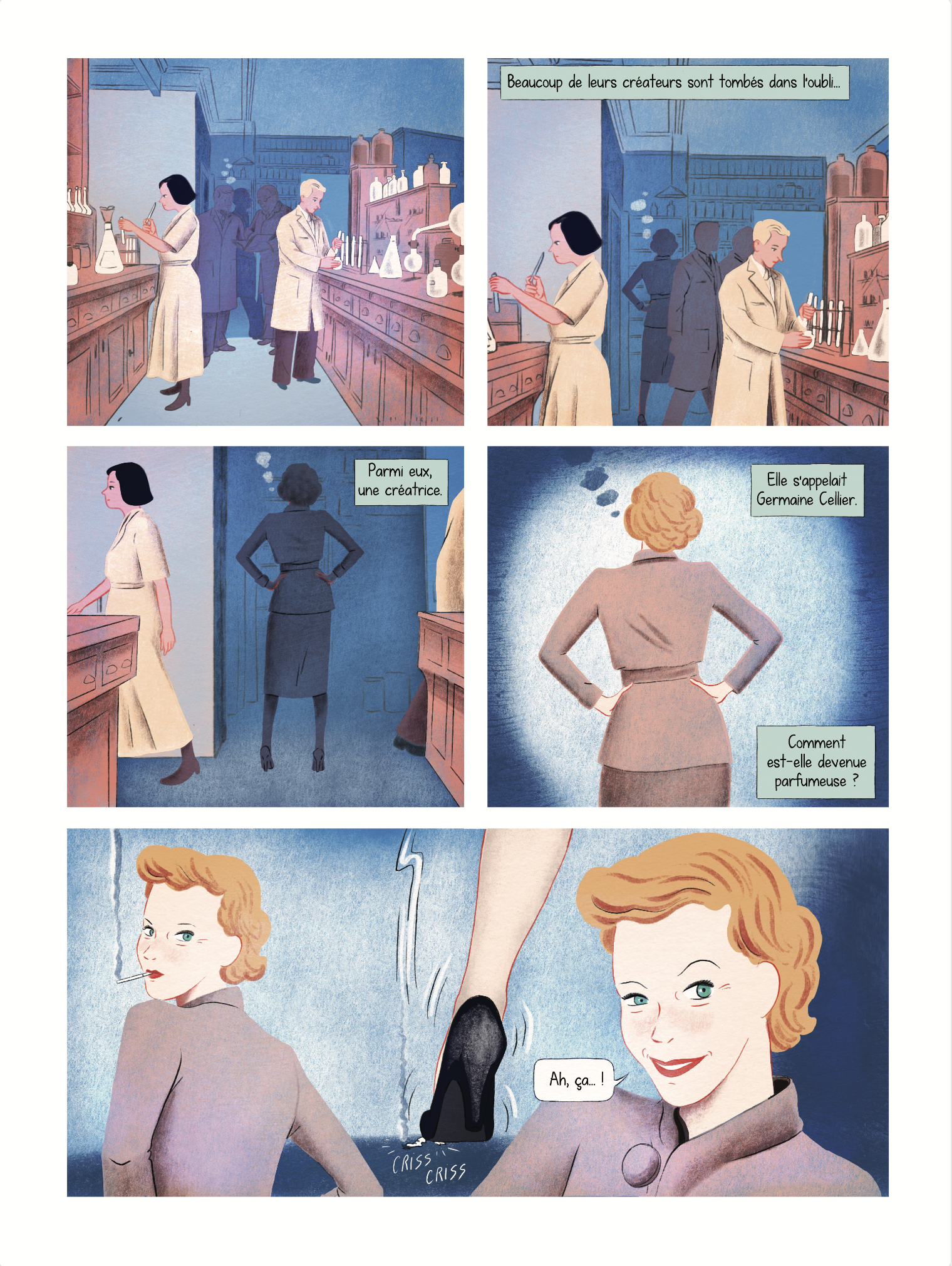 En janvier 2021, au cours d’une des nombreuses heures de veille et de recherches que j’effectue quotidiennement, je tombe sur un article de Vanity Fair« Germaine Cellier, le sens de la formule », signé Martine Azoulai, sa nièce. Je découvre alors cette incroyable personnalité tombée dans l’oubli, sauf dans le milieu de la parfumerie qui me fascine : Germaine Cellier, premier nez féminin français, qui a composé des jus inédits et novateurs entre l’Occupation et la fin des années 1960 pour Balmain, Nina Ricci, Robert Piguet. Je visualise immédiatement un roman graphique pour redonner vie à cette talentueuse créatrice, et je pense à Béatrice Égémar, autrice et designer olfactif, pour le scénario. Une discussion passionnée avec Béatrice, un dossier de présentation et voilà l’idée envoyée à Nathan bande dessinée. Karine Leclerc m’appelle sur le champ, elle veut publier ce projet et me parle très rapidement de Sandrine Revel pour l’illustration. Il va falloir être patientes… mais le résultat est là entre nos mains, et il est fabuleux. Nez, la revue olfactive, la maison Robert Piguet, la maison de création Givaudan et Olivier David de L’Osmothèque nous ont accompagnées dans ce projet.